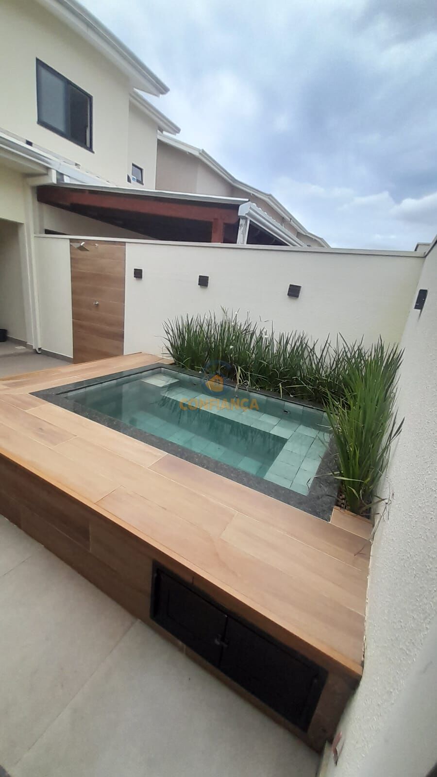 Para momentos de relaxamento, a casa conta com uma jacuzzi, criando um espaço perfeito para descanso e lazer. No pavimento superior, uma sacada com blindex complementa o charme e a ventilação do imóvel.